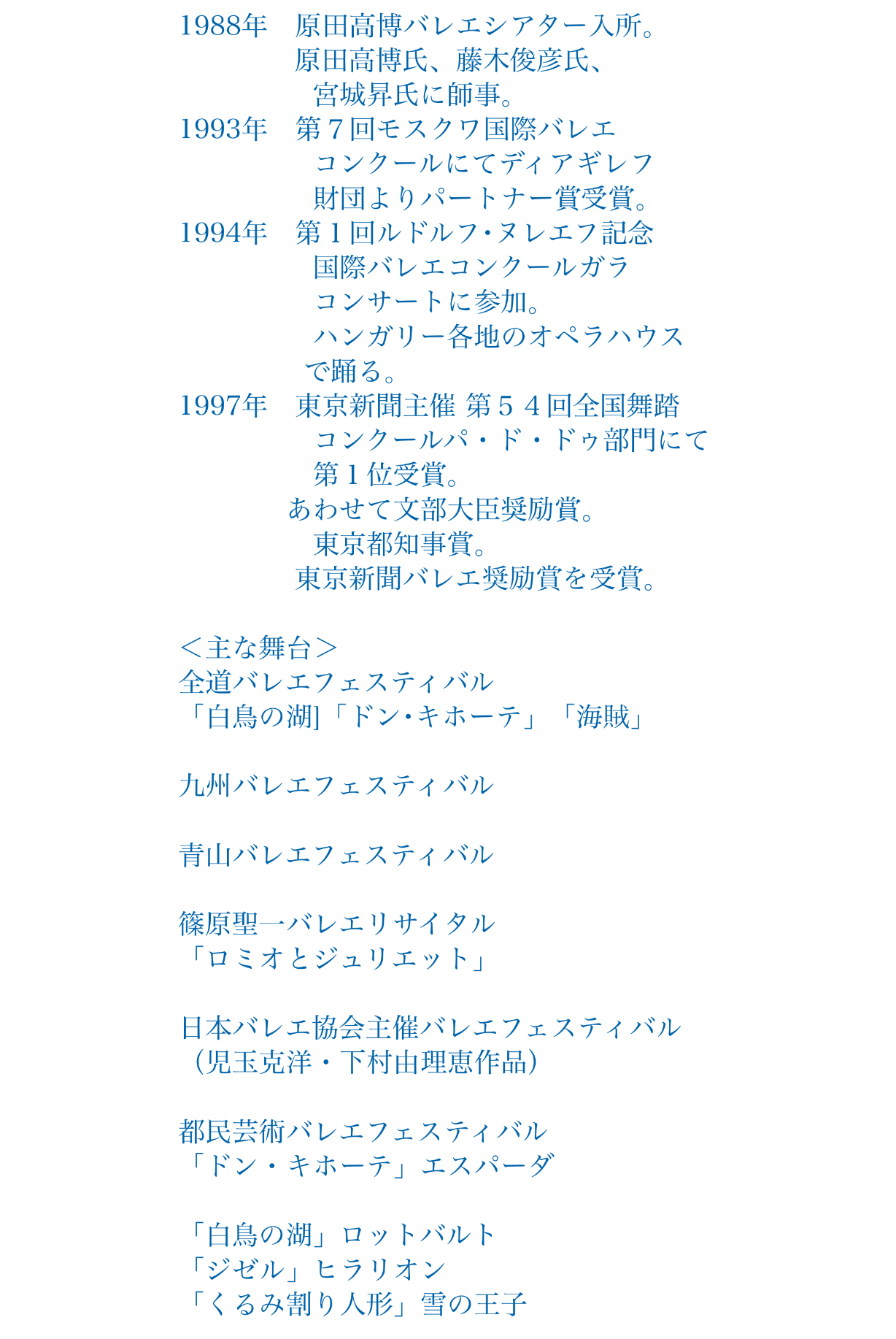 法村友井バレエ学校にて法村牧緒氏に師事。在学中 1990,1991年中ロシア・ワガノワ・バレエアカデミー 1995年にペルミ国立バレエ学校に短期留学。